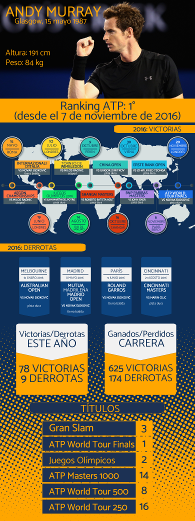 Esta infografía de (https://www.stampaprint.net/es/) nos brinda una excelente vista de lo que ha sido la carrera del escocés hasta convertirse en el mejor tenista del mundo.